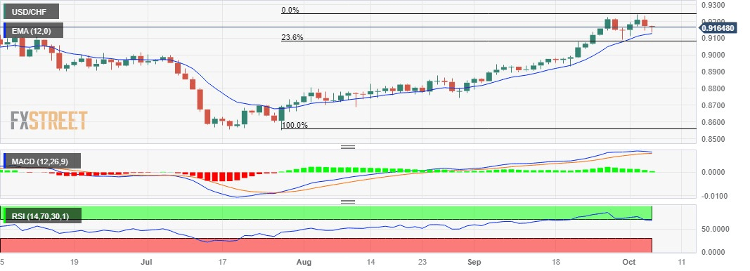 USD/CHF retraces the intraday losses, trading around 0.9170 lined up with the support level at 0.9150 psychological level during the early European session on Thursday, followed by the 12-day Exponential Moving Average (EMA) at 0.9127.