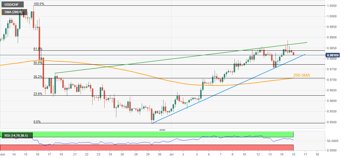 USD/CHF consolidates the biggest daily gains in three days while dropping back from a one-month high. That said, the Swiss currency pair (CHF) refreshes its intraday low to 0.9815 during Friday’s Asian session.