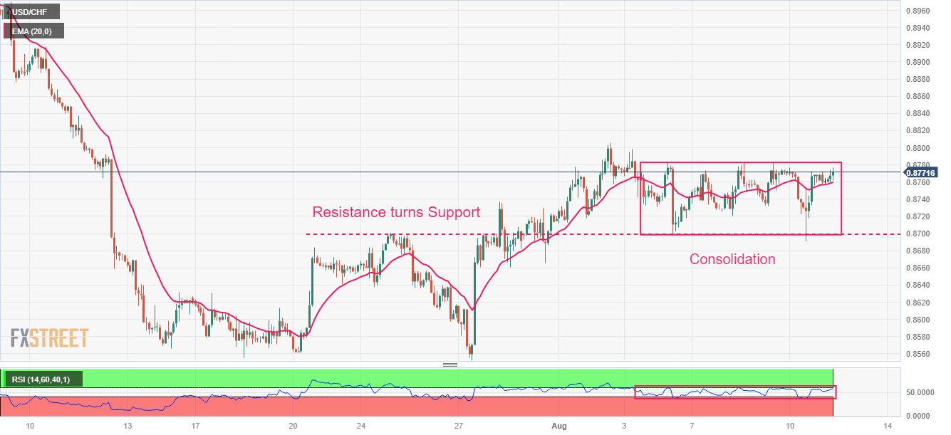 The USD/CHF pair stays in a sideways profile below the round-level resistance of 0.8800 in the European session. The Swiss Franc asset struggles to find direction despite lower-than-expected growth in the United States Consumer Price Index (CPI) data for July.
