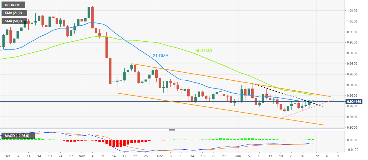 USD/CHF bulls struggle to keep the reins after a three-day uptrend as the Swiss currency pair drops to 0.9240 while flashing the first daily loss in four during early Tuesday. In doing so, the quote retreats toward the previous resistance line from January 06.