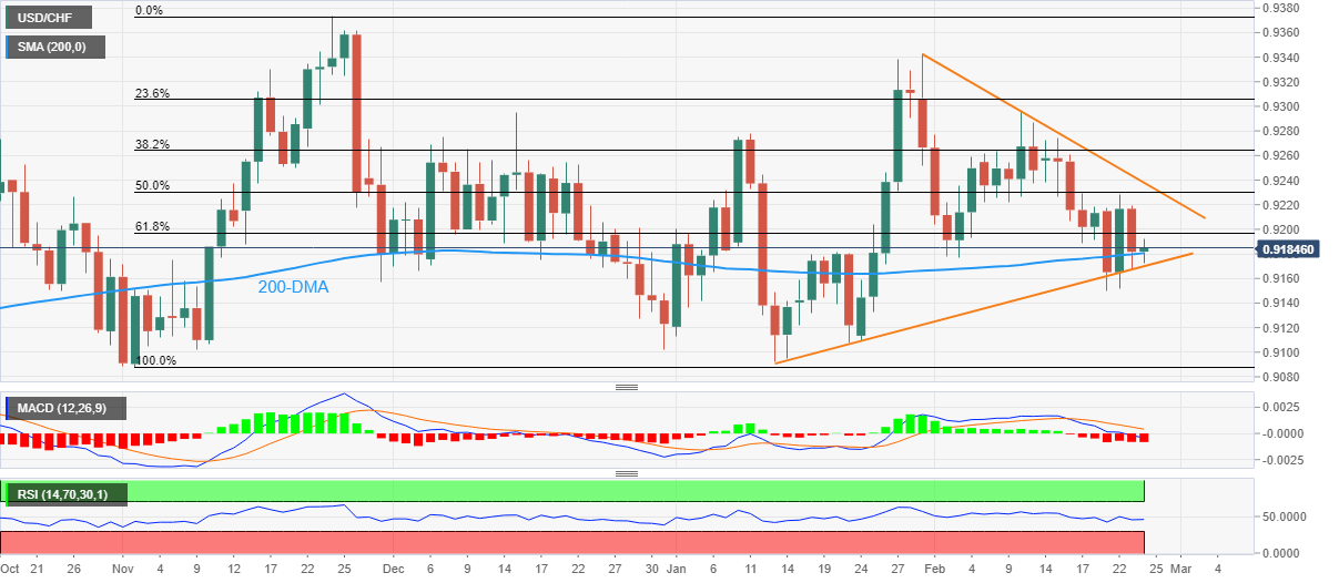 USD/CHF stays on the back foot around 0.9180 while printing the least daily moves among the Group of 10 (G10) currency pairs during early Thursday morning in Europe.