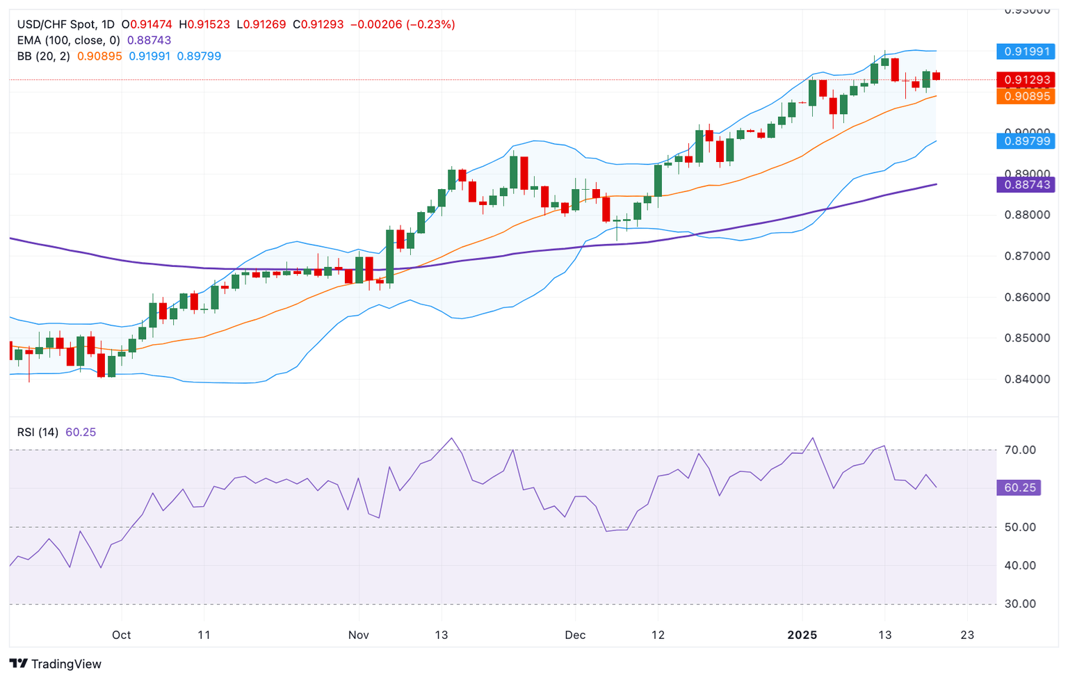 The USD/CHF pair edges lower to near 0.9130 during the Asian trading hours on Monday, pressured by the weakening of the US Dollar (USD). The cautious mood in the markets ahead of Donald Trump’s presidential inauguration provides some support to the safe-haven flows, benefiting the Swiss Franc (CHF).