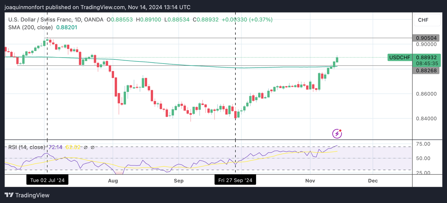USD/CHF breaks above the 200-day Simple Moving Average (SMA) and extends its short and medium-term uptrend.