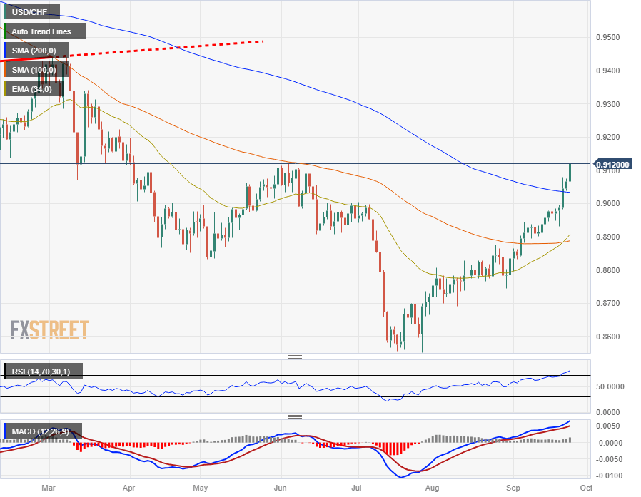 The USD/CHF is pinned to the high side in Monday trading, reaching the 0.9130 region. Another move higher will have the pair testing into new five-month highs.