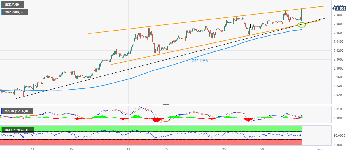 Hence, the stated wedge’s top line near 7.1140 appears the immediate key hurdle to cross for the USD/CNH bulls to keep the reins. Following that, October 2022 low surrounding 7.1660 may gain the market’s attention.