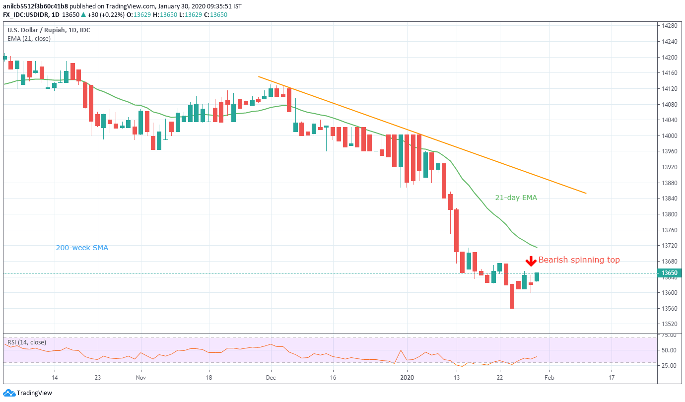 USD/IDR flashes an intraday high of 13,650 ahead of the European session on Thursday. In doing so, the pair ignores the previous day’s bearish spinning top candlestick formation while rising towards 21-day EMA.