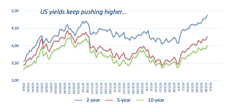 On the latter the short end of the curve gradually approaches the key 5% threshold for the first time since early July 2007 along with persistent hawkish Fedspeak and dwindling probability of a 25 bps rate hike at the Fed’s March 22 gathering.