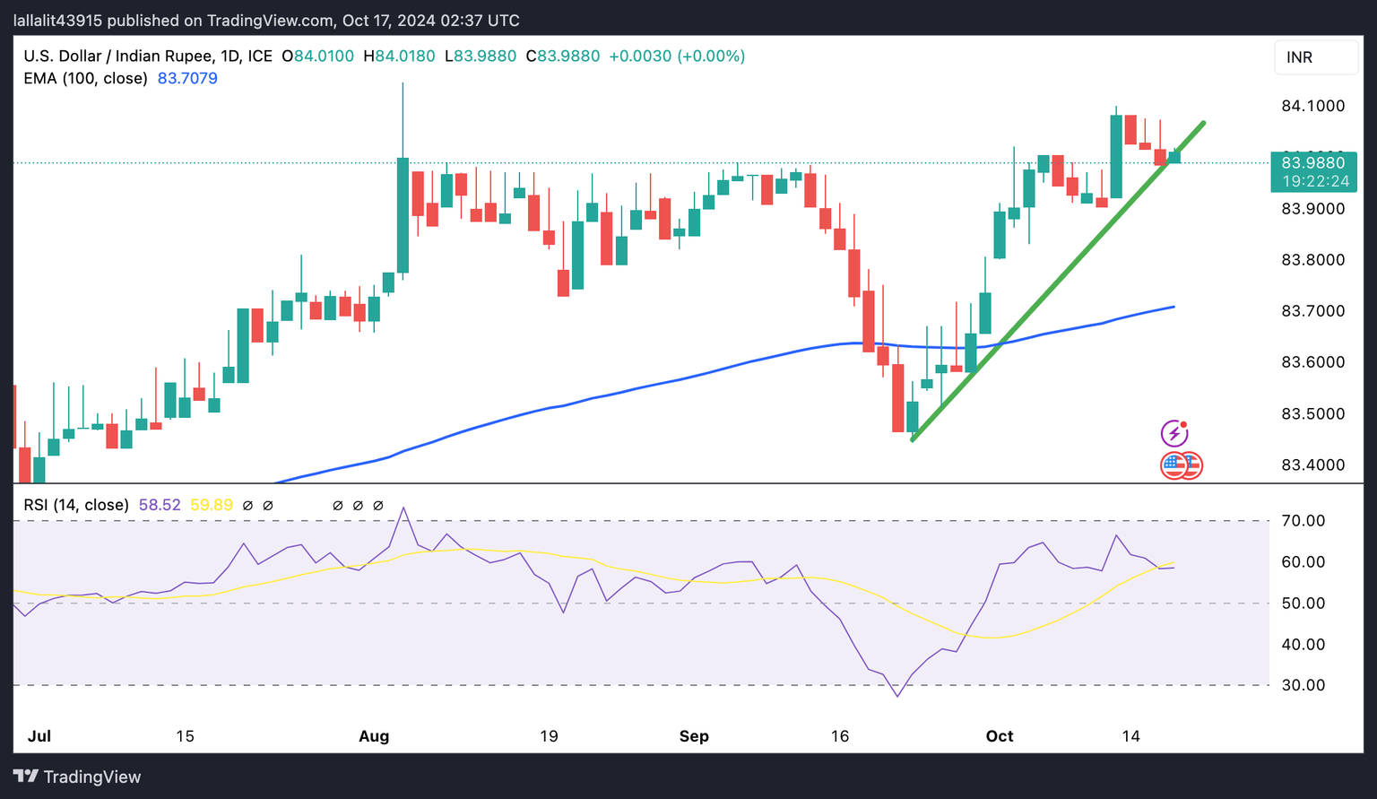The Indian Rupee trades in negative territory on the day. Technically, the USD/INR pair keeps the bullish vibe as the price holds above the ascending trend line and the key 100-day Exponential Moving Average (EMA) on the daily chart. The upward momentum is supported by the 14-day Relative Strength Index (RSI), which is located above the midline near 58.80, hinting that the uptrend is more likely to gain traction than reverse.