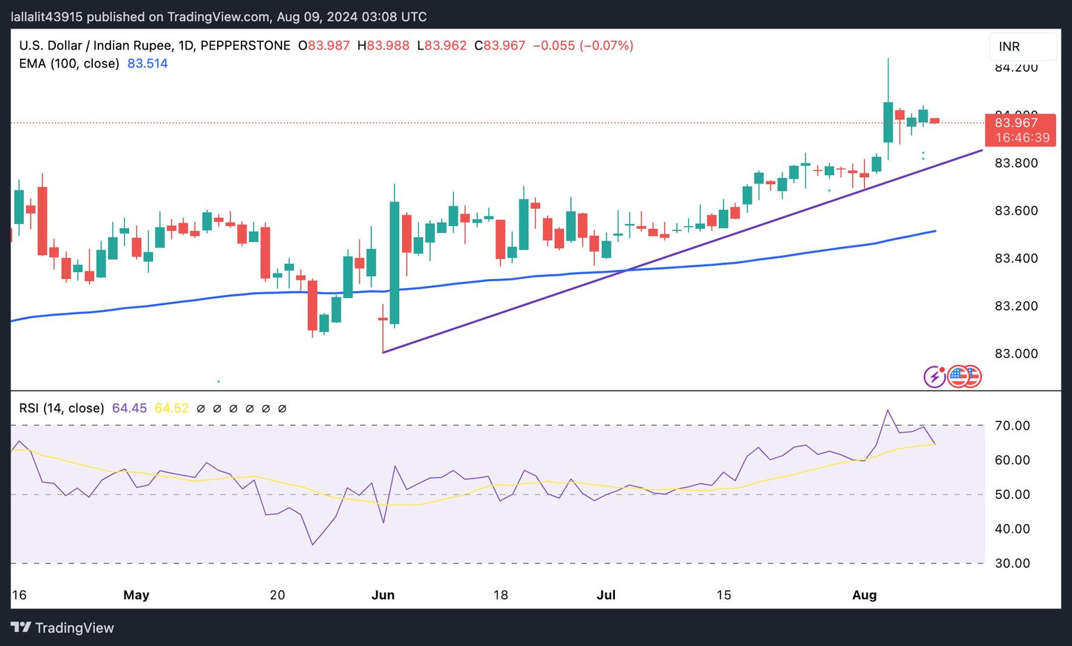 On the flip side, the uptrend line around 83.80 acts as a key contention level for the pair. A breach of the mentioned level could drag the pair lower to the 100-day EMA at 83.51.