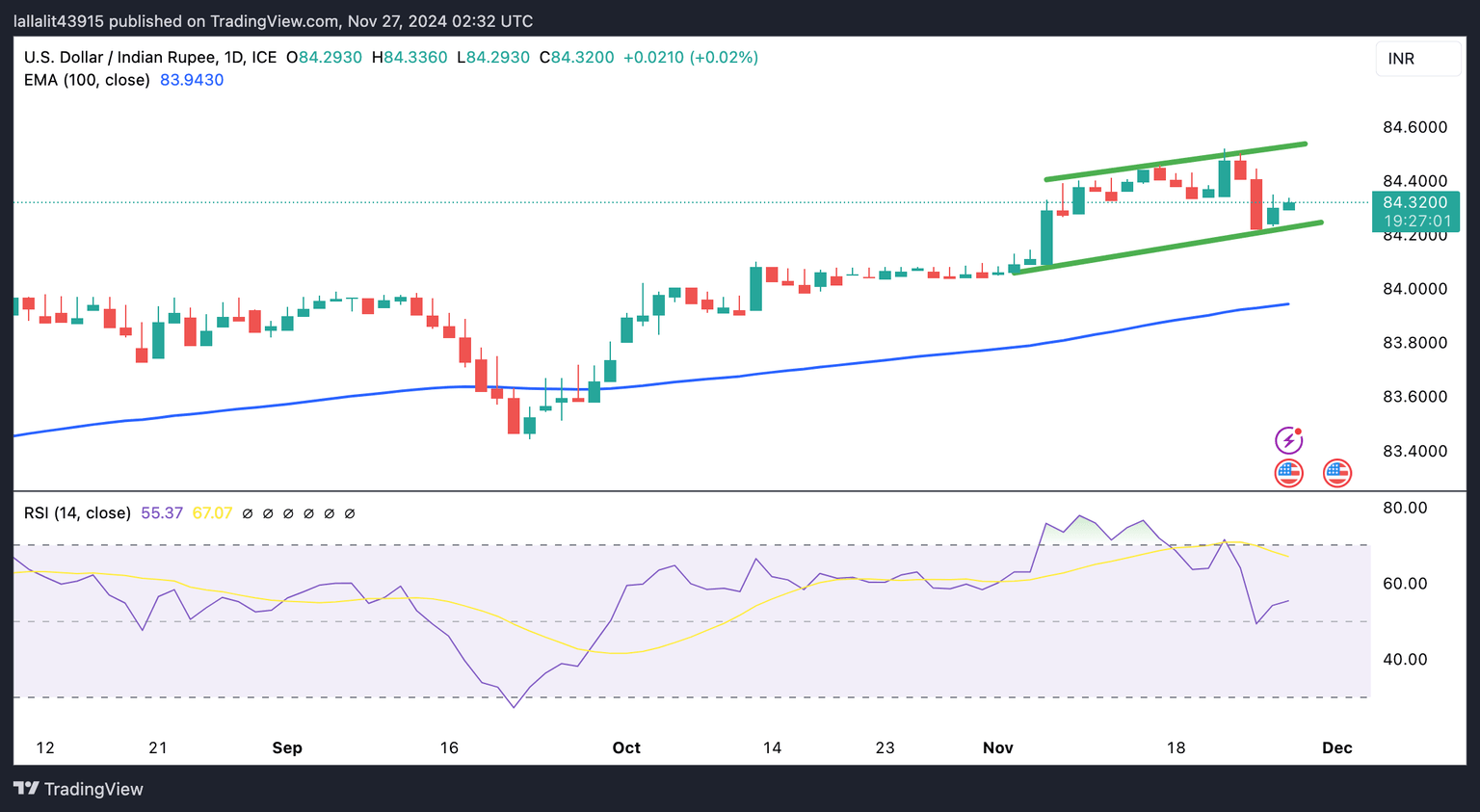 The Indian Rupee trades weaker on the day. The USD/INR pair keeps the bullish vibe within an ascending trend channel on the daily chart, with the price holding above the key 100-day Exponential Moving Average (EMA). The upward momentum is supported by the 14-day Relative Strength Index, which is located above the midline near 55.30, suggesting further upside looks favorable.