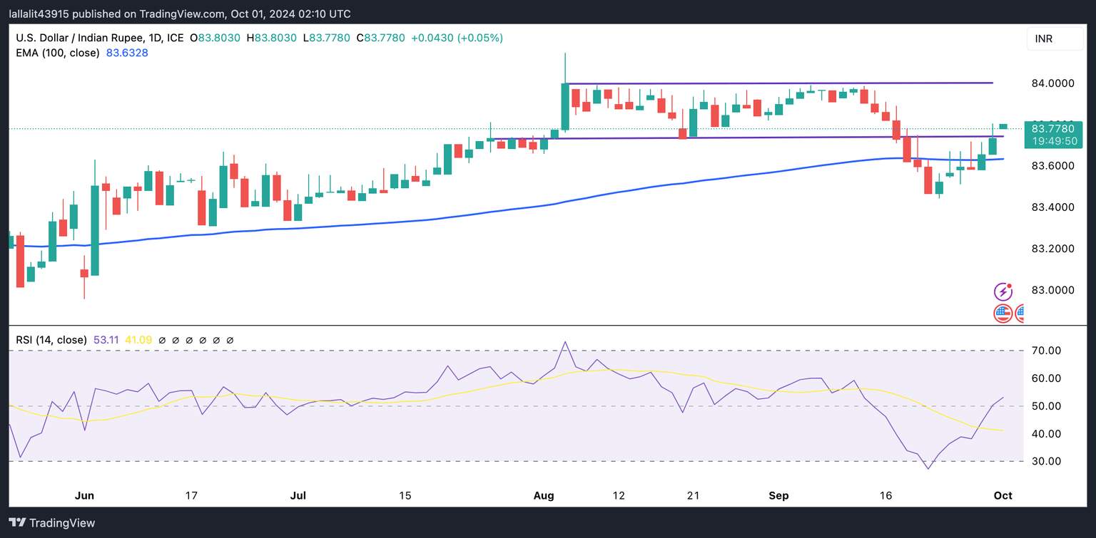 The Indian Rupee trades on a weaker note on the day. The USD/INR pair keeps the bullish vibe on the daily timeframe as the price holds above the key 100-day Exponential Moving Average (EMA). Nonetheless, further consolidation cannot be ruled out as the 14-day Relative Strength Index (RSI) hovers around the midline, indicating neutral momentum.