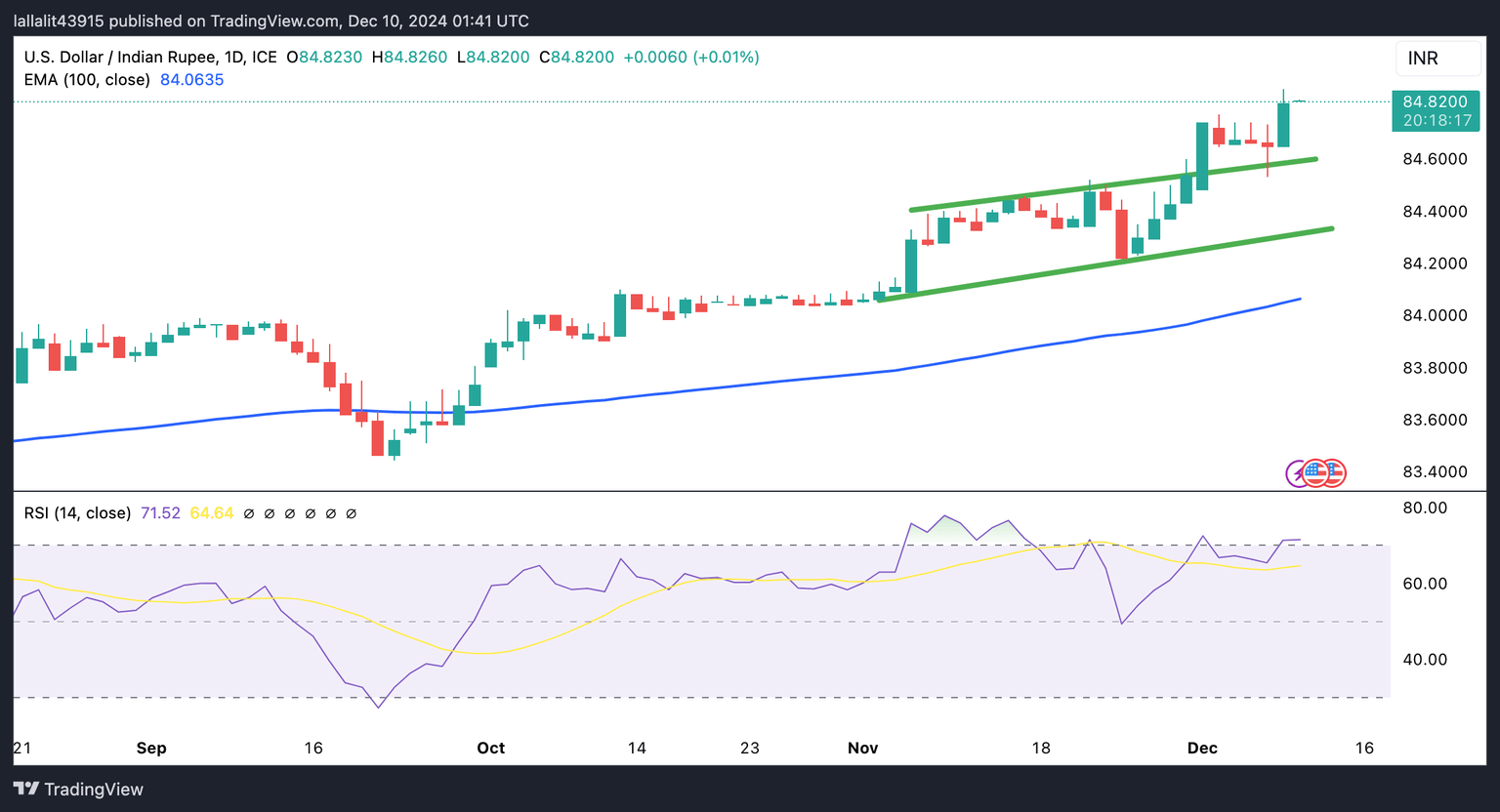 The all-time high of 84.86 acts as an immediate resistance level for USD/INR. Consistent trading above this level could pave the way to the 85.00 psychological level, en route to 85.50.