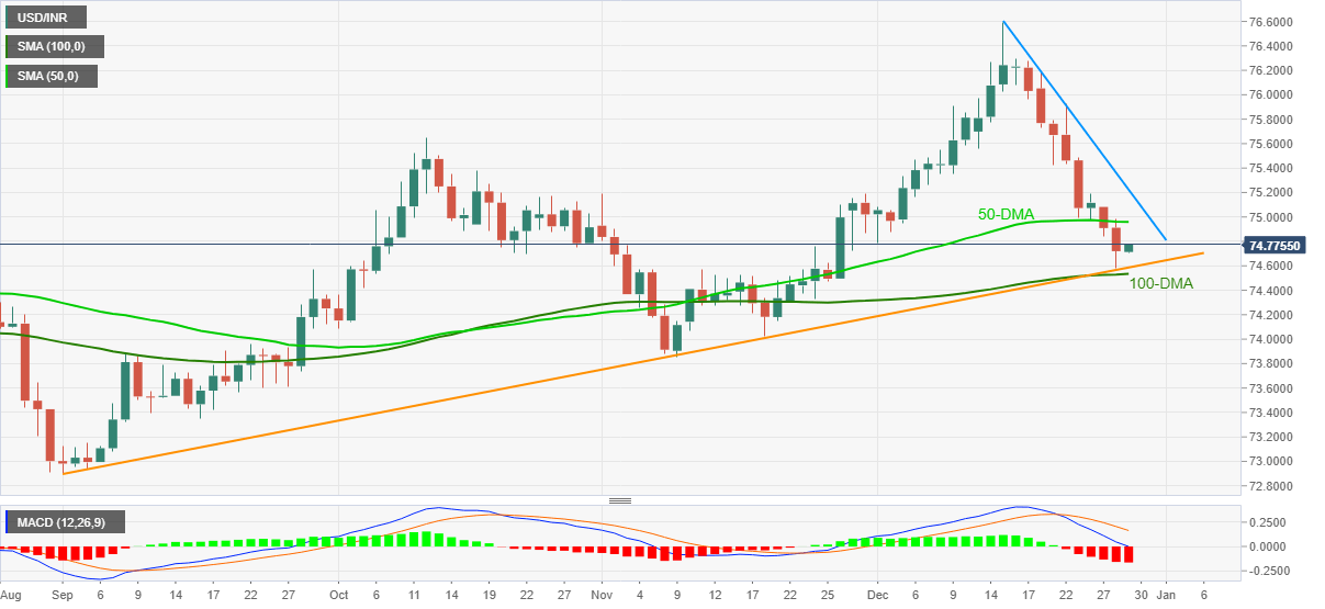 The Indian rupee (INR) pair dropped to the lowest levels since November 26 the previous day before bouncing off 74.58. The corrective pullback took place near an ascending trend line from early September, as well as the 100-DMA.