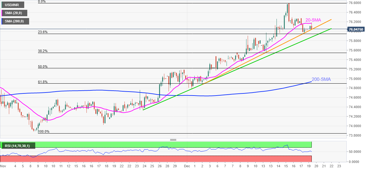 USD/INR eases from an intraday high of 76.18 to 76.05 during early Monday morning in Europe. In doing so, the Indian rupee (INR) pair steps back from 20-SMA while consolidating the biggest daily loss since early November.