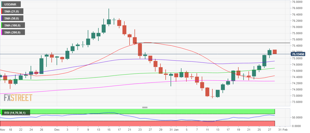 If the correction gathers steam, then USD/INR bears could the mildly bullish 50-Daily Moving Average (DMA) at 74.90.