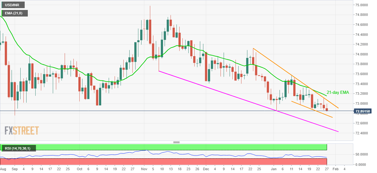 With the pair’s repeated failures to cross a descending resistance line from December 23 as well as 21-day EMA, amid an absence of oversold RSI conditions, USD/INR sellers have some room on the downside.