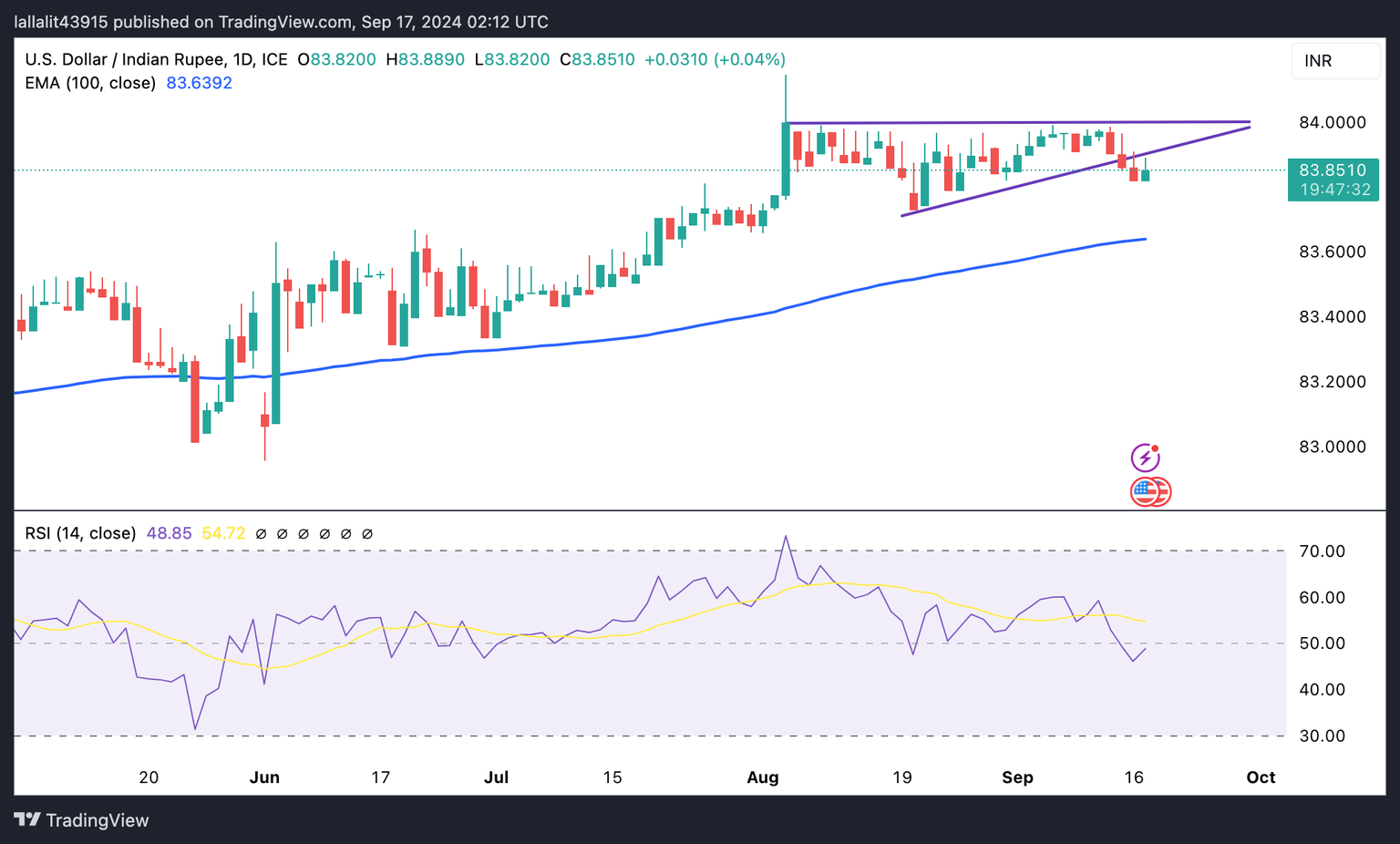 On the downside, the low of September 16 at 83.82 acts as an initial support level for USD/INR. Any follow-through selling below this level will expose the 100-day EMA at 83.64.