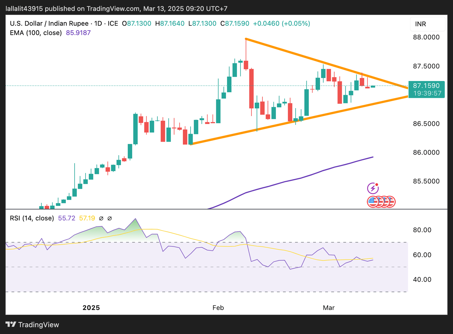 USD/INR oscillates in a symmetrical triangle