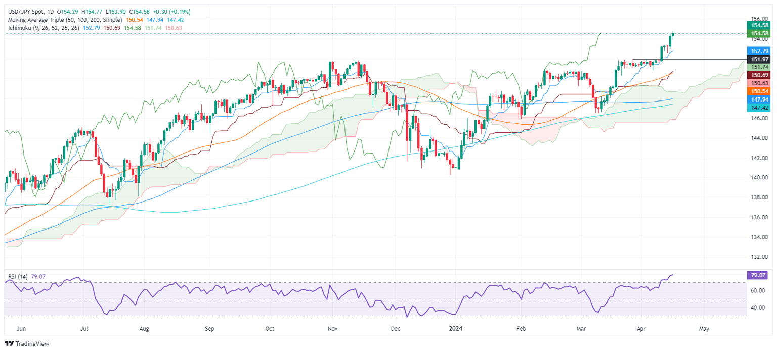 The US Dollar clocks gains versus the Japanese Yen in early trading during the North American session. Strong economic data from the United States (US) and neutral to hawkish comments by US Federal Reserve officials boost the Greenback. The USD/JPY trades at 154.61, 0.22% above its opening price.