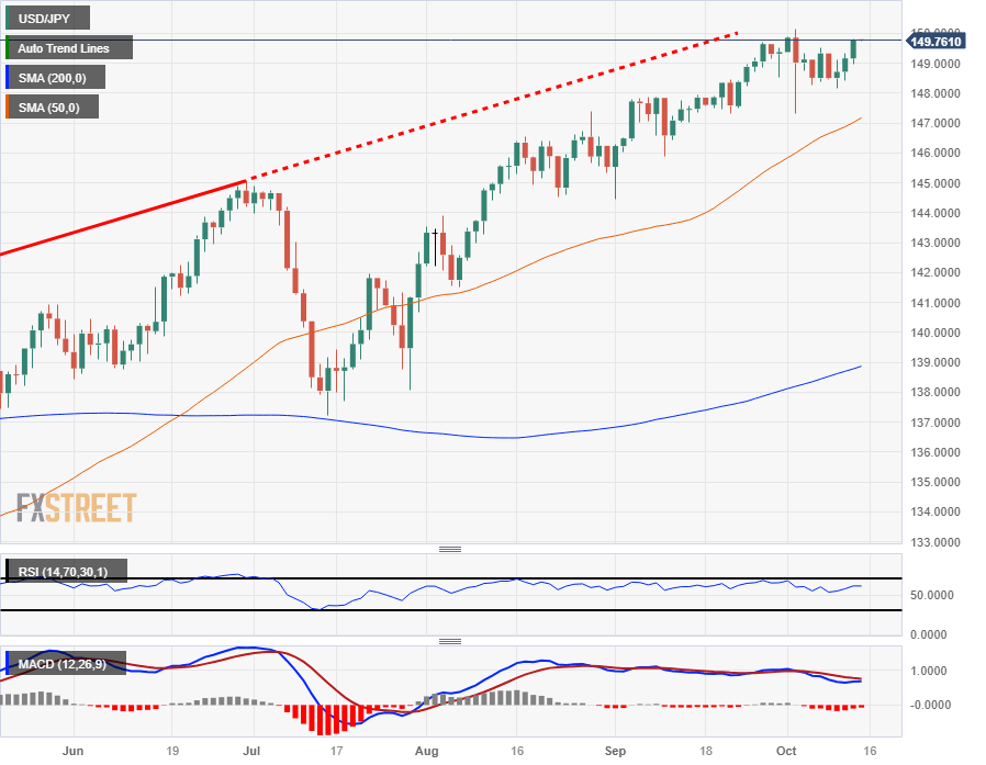 The USD/JPY is hanging close to Thursday's highs of 149.83, just inches away from the 150.00 major handle. The pair is well-bid off the day's early lows near 148.95, and USD/JPY gained 0.42% on Thursday to close out trading just shy of 149.80.