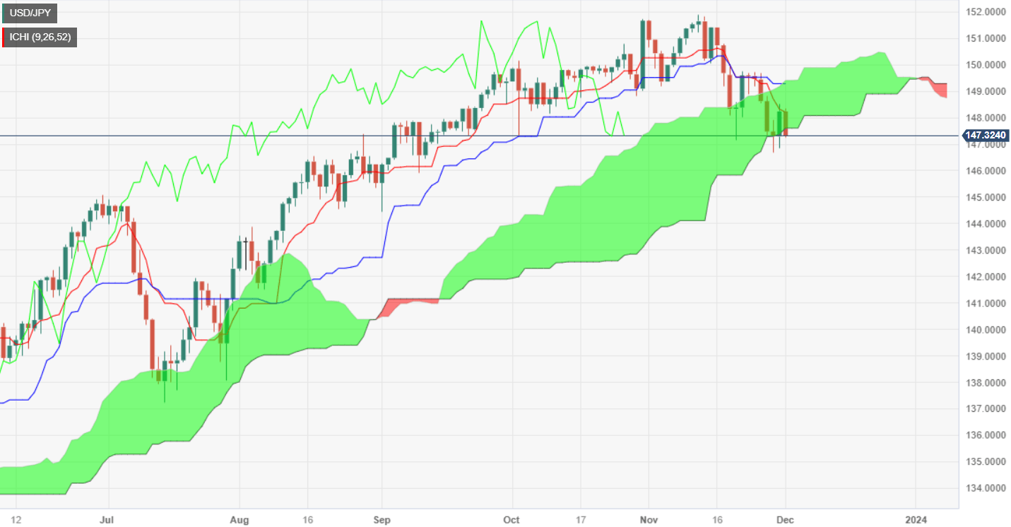 The USD/JPY trims some of its Thursday gains on Friday, diving below the Ichimoku Cloud (Kumo) early in the North American session. At the time of writing, the pair is exchanging hands at 147.35, registering losses of 0.58%.