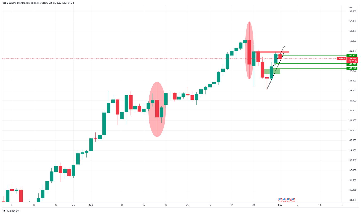 - USD/JPY bears have eyes on the upper quarter of the 147 area and then the 146.50s.
