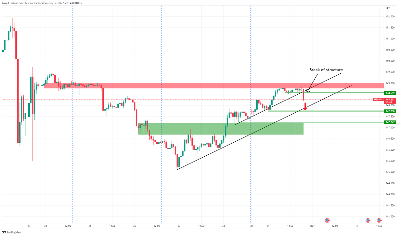 The price has broken a key level of structure in this move which could equate to further downside for the day ahead, with eyes on the upper quarter of the 147 area. Below there, the bears will be focussed on the lower quarter that guards room all the way through to a test of the broader trendline and the 146.50s.