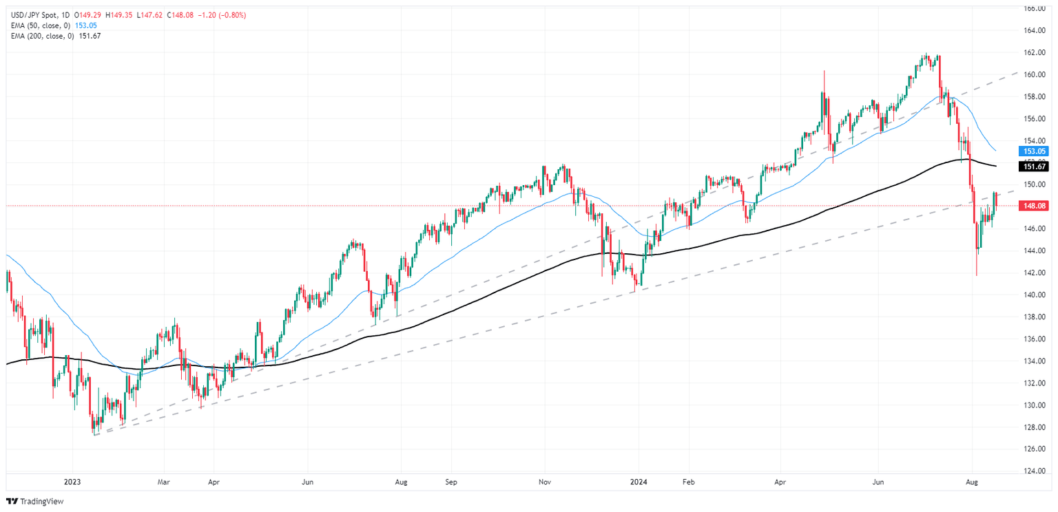 Friday’s decline in USD/JPY bids has dropped the pair back below a rising trendline on daily candlesticks, but price action is still drifting into the high end as buyers take a breather. USD/JPY continues to trade on the south side of the 200-day Exponential Moving Average (EMA) near 151.67, and a poorly-timed break in bullish pressure could see another shortside technical leg begin to form as intraday bids grapple with technical levels below 149.00.