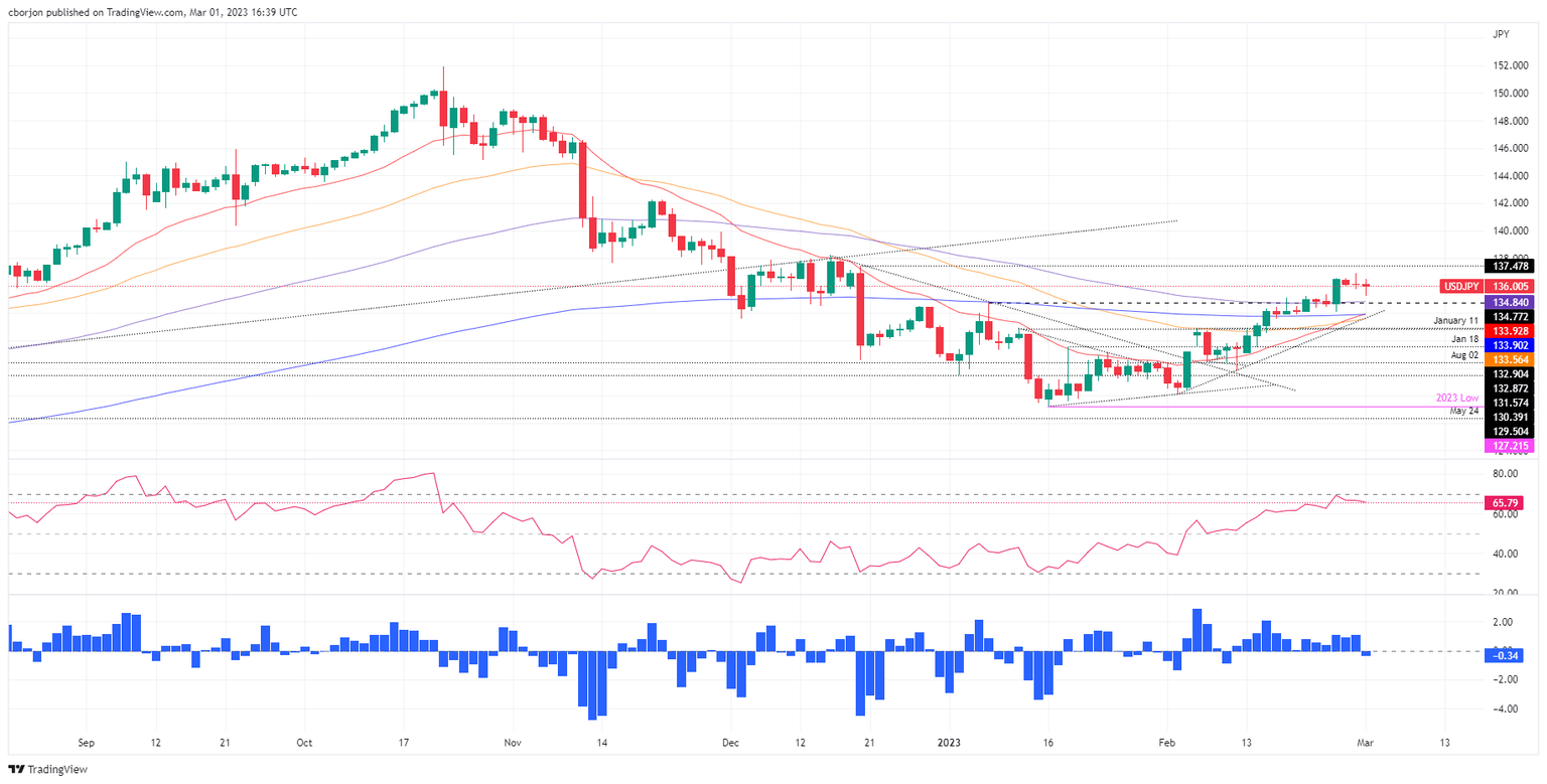 The USD/JPY remains pressured, though capped by recent US economic data, as the US ISM Manufacturing PMI for February fell short of estimates. However, some subcomponents show that again prices are rising. The USD/JPY is exchanging hands at 136.08.