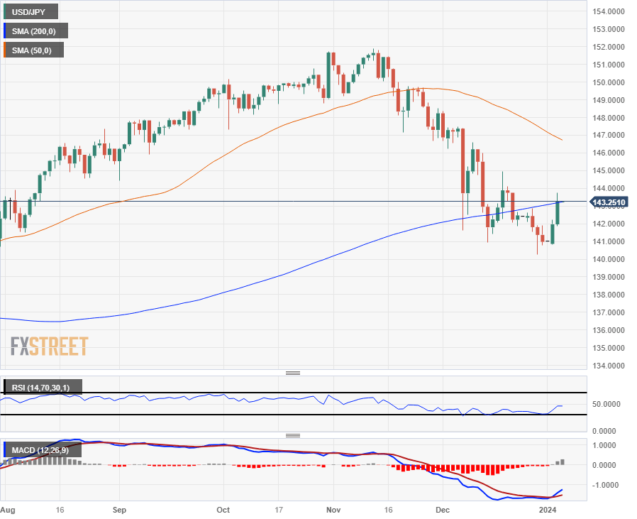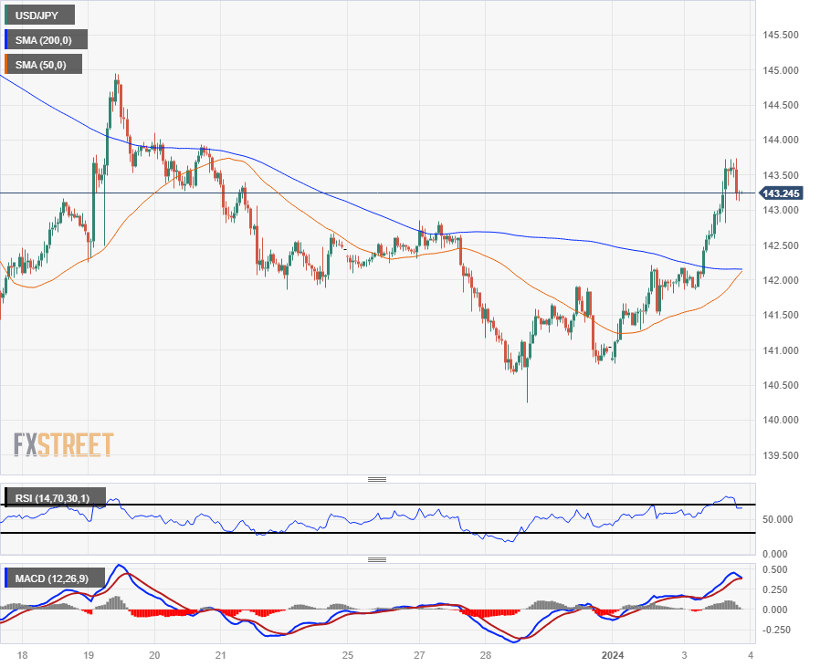 The USD/JPY’s rally on Wednesday took the pair cleanly through the 200-hour Simple Moving Average (SMA) just above 142.00, sending the pair just shy of 143.75 before settling back towards the 143.00 handle.