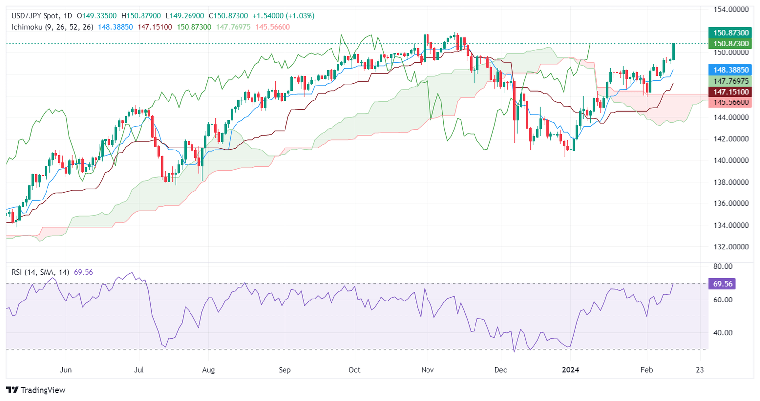 The daily chart portrays the pair's upward bias, with 151.00 as the next resistance level. Once that level is cleared, the USD/JPY next stop would be last year’s 151.91 high, followed by the 152.00 mark. Conversely, if sellers regain the 150.00 level, that could open the door for further losses. In that case, key support levels would be tested. Firstly, the Tenkan-Sen at 148.38, followed by the Senkou Span A at 147.77. Once those two levels are cleared, the next stop would be the Kijun-Sen at 147.15.
