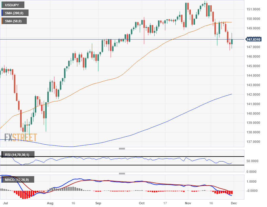 The US Dollar (USD) is trying to claw back chart paper from the Japanese Yen (JPY) on Thursday, but struggling to decisively re-mount the 148.00 handle.