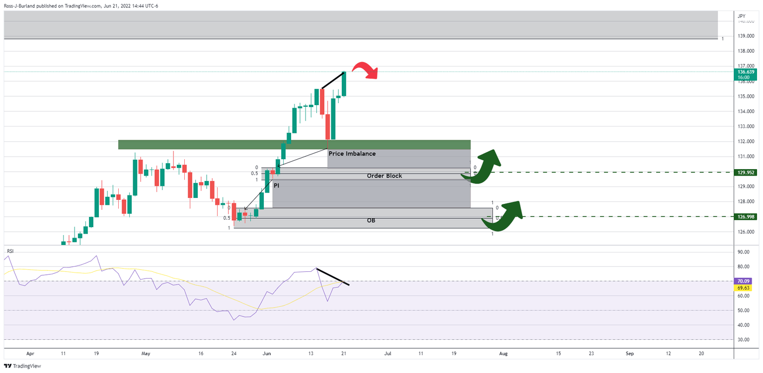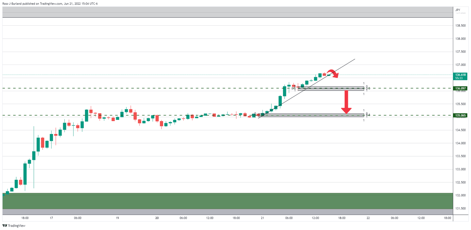 From an hourly perspective, the price is starting to round off. The significant downside prospects will kick in on a break of 136.00 and 135.06 respectively as midpoints of hourly order blocks.