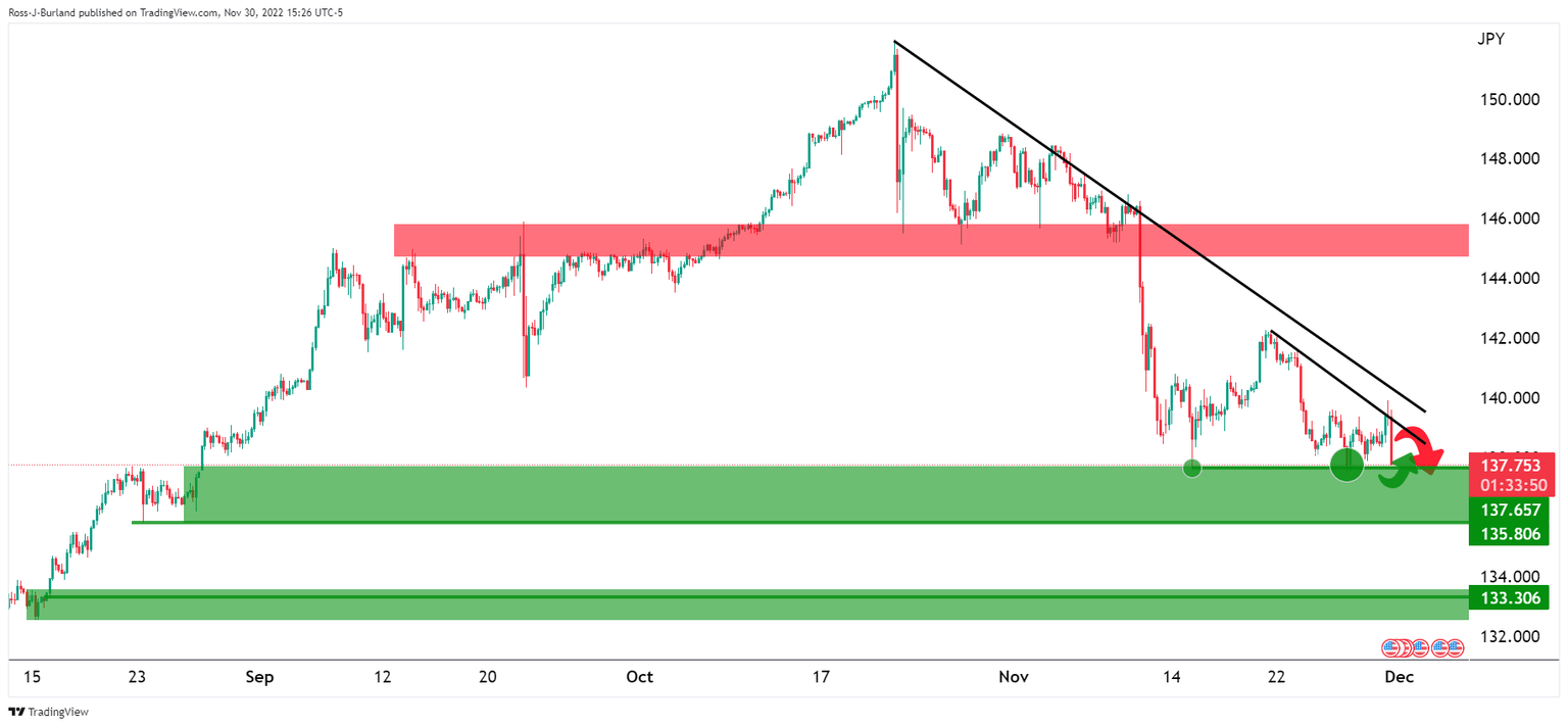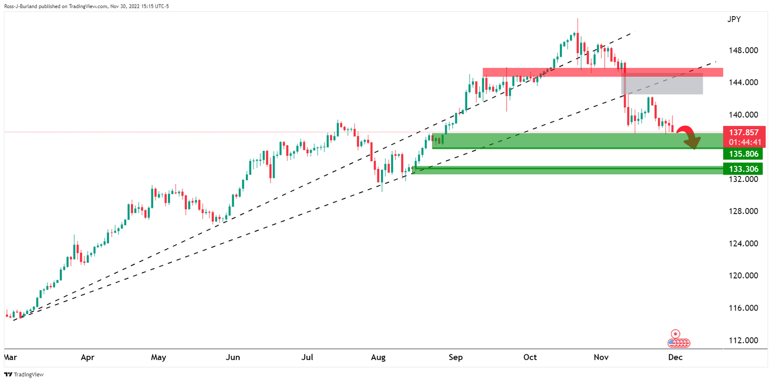USD/JPY Price analysis: Bears eye a break of key support structures