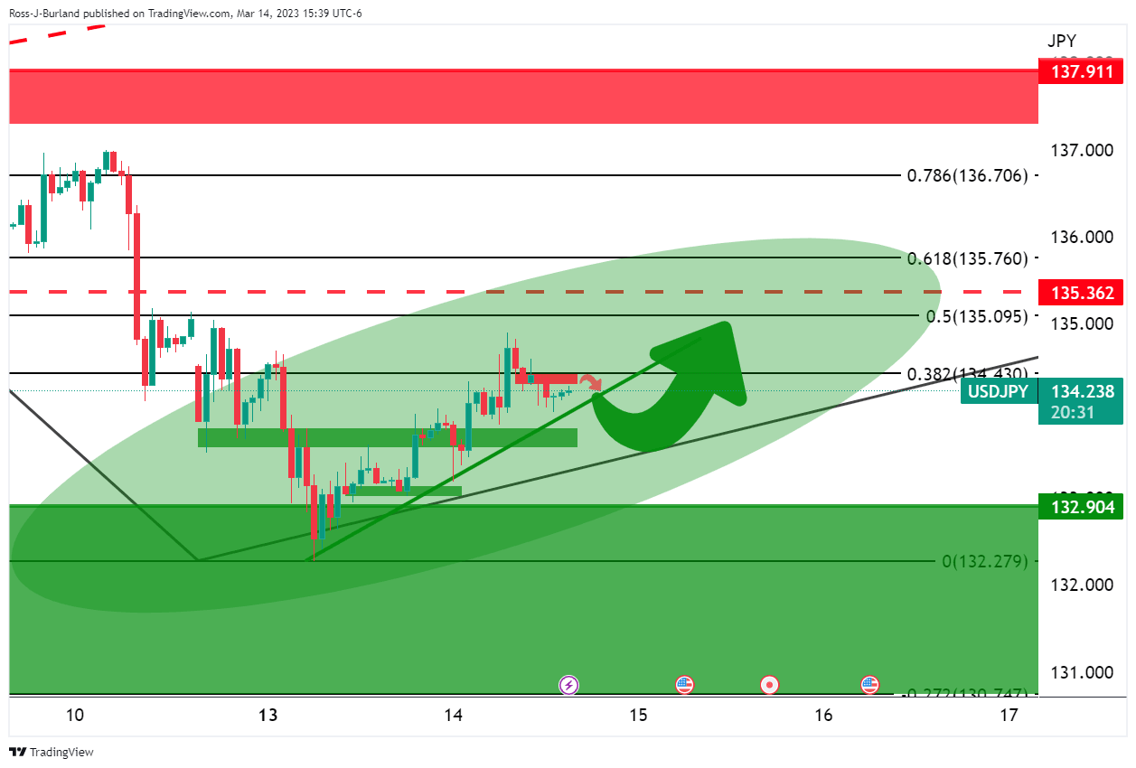 It was stated, that ´´on a daily basis, USD/JPY is moving into a support zone that could result in a correction ahead of the US CPI data with the 134.50-70 eyed as per the daily Fibonacci scale as illustrated above. However, on a lower time frame:´´