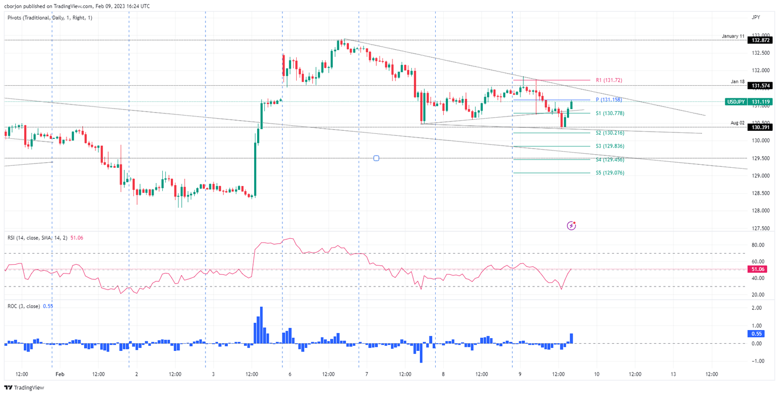 USD/JPY buyers need to reclaim 131.82, Thursday’s high. Once done, that would pave the way towards 132.00, 132.87, and the psychological 133.00 barrier. As an alternate scenario, the bearish continuation would resume if the falling wedge breaks downwards. Therefore, the USD/JPY first support would be 130.34, February 9 low. The break below will expose the S2 and S3 daily pivot points, each at 130.21 and 129.83.