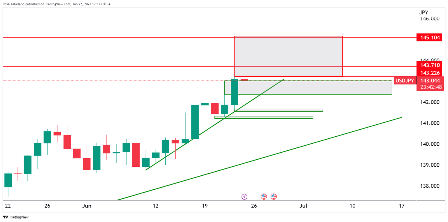 The Japanese yen held near 143 per dollar and at the bullish cycle's weakest levels while the BOJ is expected to keep ultra-low interest rates unchanged and maintain its current yield curve control policy. Bank of Japan Governor Kazuo Ueda reiterated the bank’s resolve to maintain an ultra-loose monetary policy to sustainably achieve the 2% inflation target which leaves the Yen vulnerable. However, there are prospects of a meanwhile correction as the following illustrates.