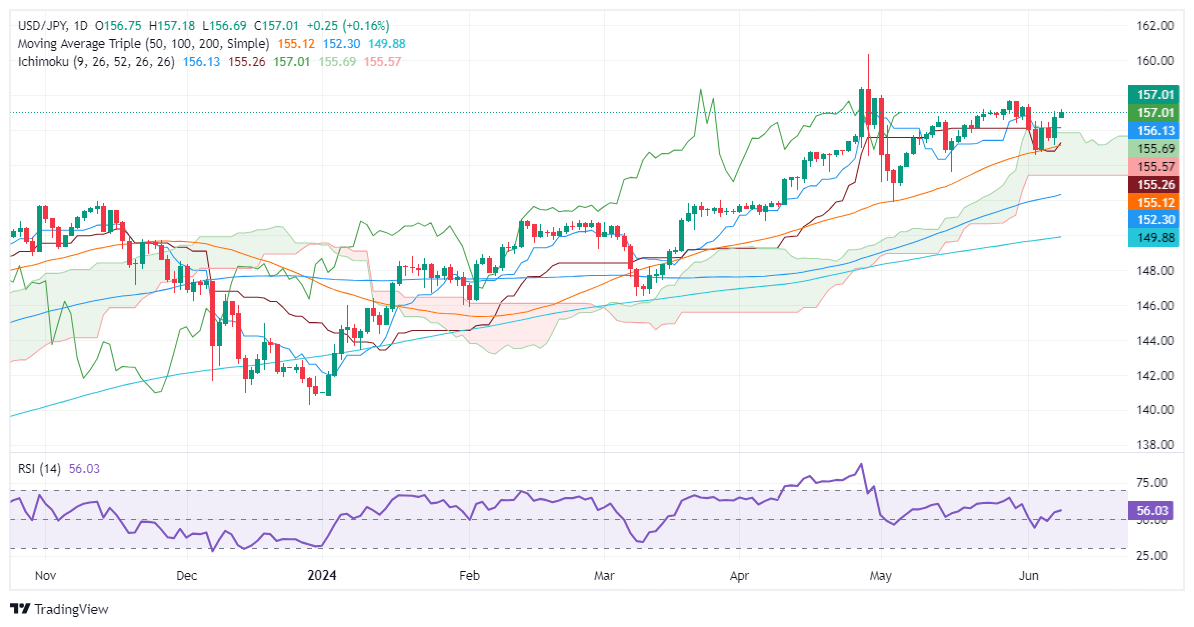 The USD/JPY jumped above the 157.00 figure on Monday, following last week’s stronger-than-expected employment data. Estimates that May’s inflation would likely remain high, with data pending to be released on Wednesday, ahead of the Federal Reserve’s monetary policy decision, drive the Greenback higher. The pair trades at 157.03, up 0.16%.