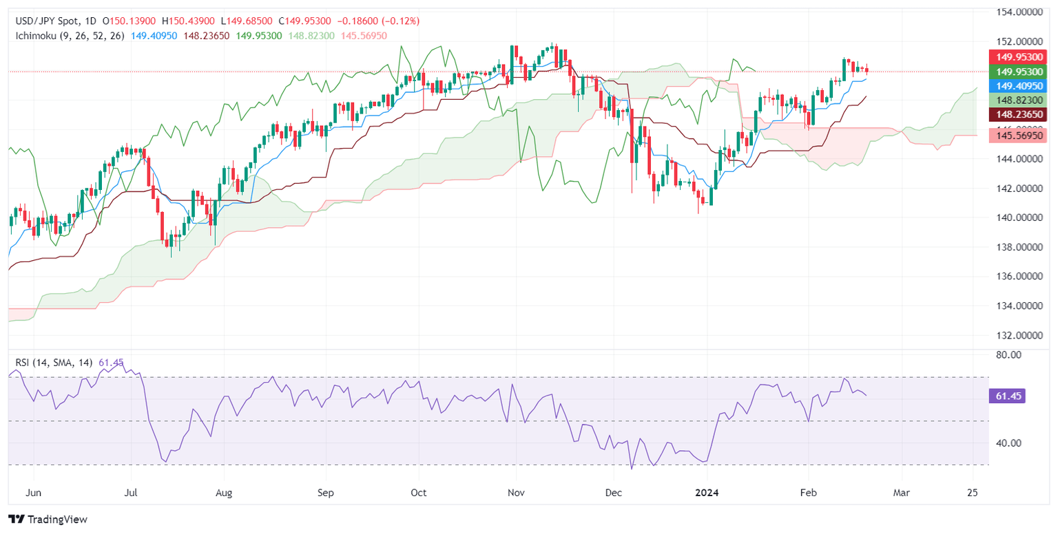 - USD/JPY hovers at 149.96, influenced by a dip in US Treasury yields and a subdued Dollar.