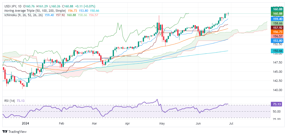 The USD/JPY extended its gains on Friday and is set to end the week with more than 0.50% gains after US economic data spurred a jump in the US Treasury, despite increasing speculations that the US central bank could cut rates in 2024. The USD/JPY trades at 160.89, up 0.08%.