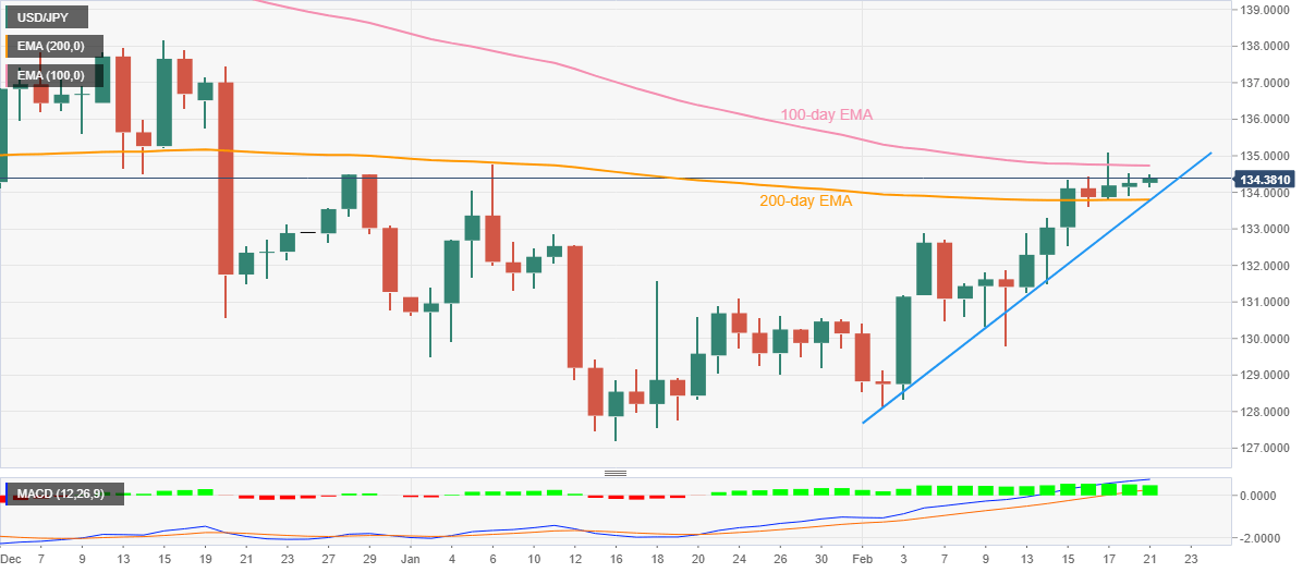 That said, the 200-day Exponential Moving Average (EMA) joins an upward-sloping trend line from February 02 to restrict the USD/JPY pair’s immediate downside near 133.80. However, the 100-day EMA level surrounding 134.75 guards nearby the upside.