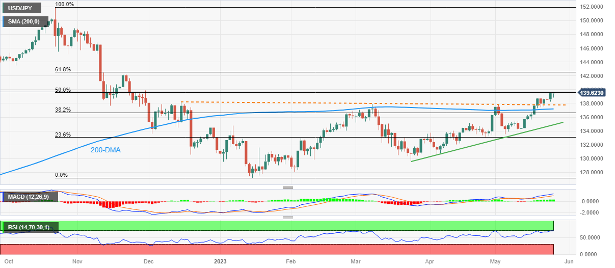 USD/JPY edges higher as it renews the yearly top around 139.65-70 during early Thursday. In doing so, the Yen pair prods the 50% Fibonacci retracement level of its October 2022 to January 2023 downside amid overbought conditions of the RSI (14) line.