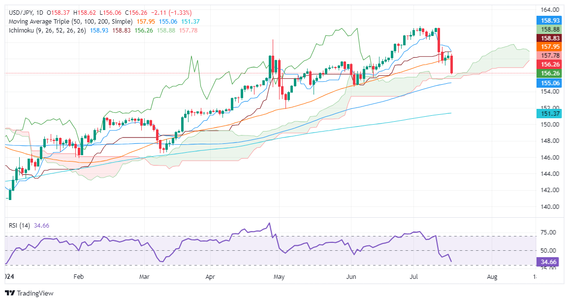The USD/JPY falls sharply on Wednesday, down by more than 1.30% and approaching the top of the Ichimoku Cloud (Kumo) at around 156.00. At the time of writing, the pair exchanged hands at 156.32 after diving from a daily high of 158.62.
