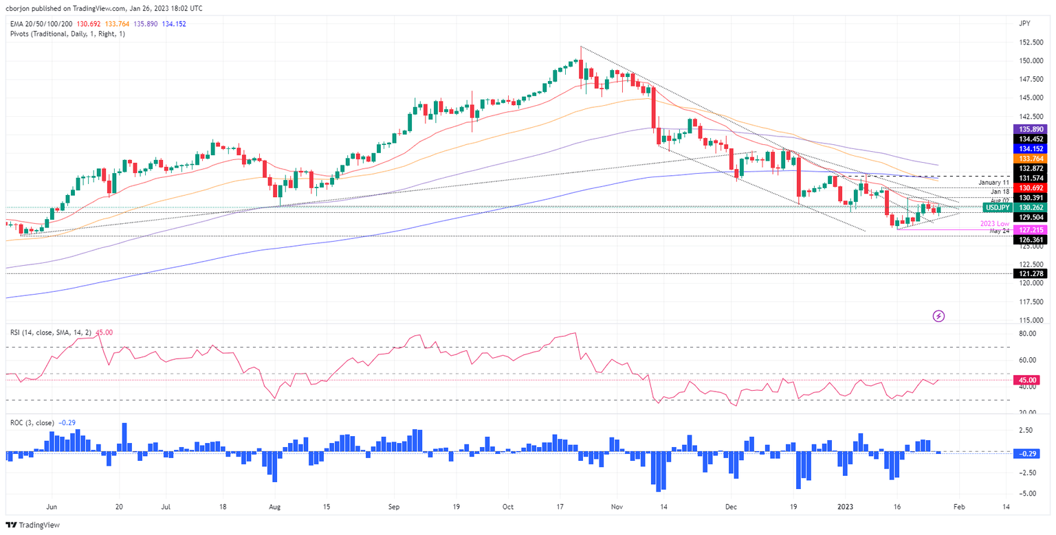 The USD/JPY bounces from weekly lows reached early Thursday at 129.02 and reclaimed the 130.00 psychological level, eyeing a test of the 20-day Exponential Moving Average (EMA) at 130.70. Nevertheless, the USD/JPY fell short and hit a daily high at 130.61, settling around current exchange rates. At the time of writing, the USD/JPY is trading at 130.34.