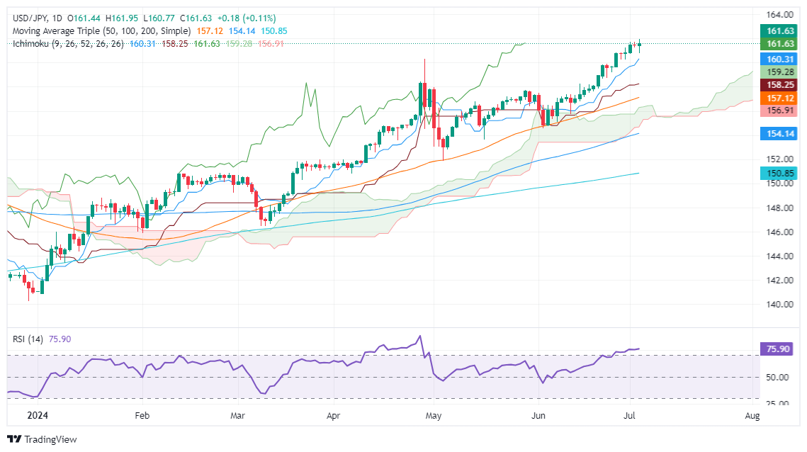 The uptrend remains intact in the USD/JPY pair amid increasing risks that Japanese authorities or the Bank of Japan could intervene in the FX markets. The major continues to advance steadily and trades at multi-year highs, with buyers eyeing a test of the 162.00 psychological level.