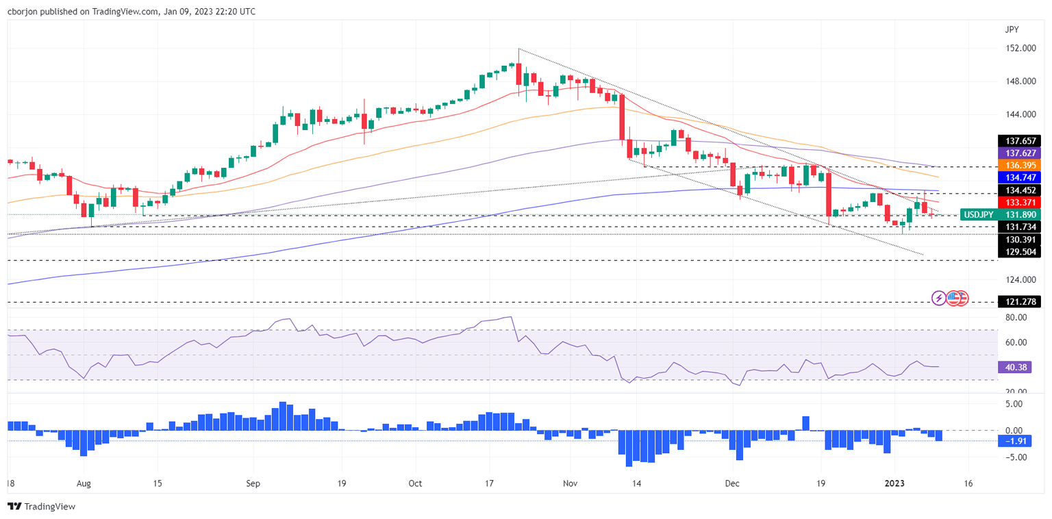 The USD/JPY is almost flat as Monday’s New York session wanes, printing a doji preceded by a bearish engulfing candle pattern that failed to trigger downward action. The USD/JPY dived as low as 131.30, still almost unchanged, down by 0.17%. At the time of typing, the USD/JPY is trading at 131.88.
