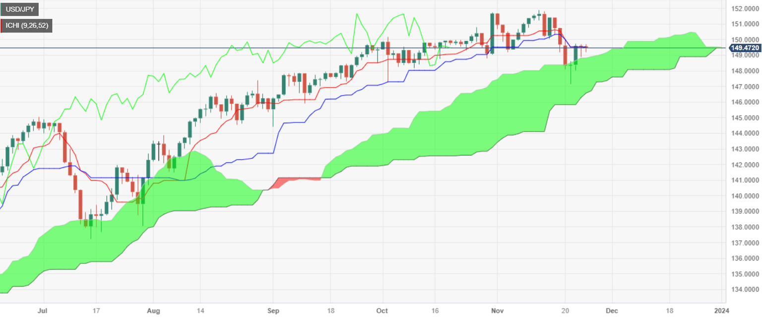 The USD/JPY daily chart shows back-to-back session posting doji’s, which implies traders are undecided. On the upside, traders will collide with the Tenkan-Sen at 149.47, followed by the 150.00 figure, and the November 17 swing high at 150.77. Once cleared, the next resistance would be the year-to-date (YTD) high of 151.91.