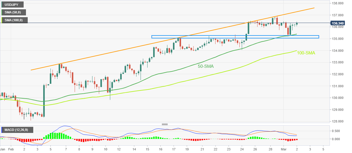 USD/JPY struggles to overcome the previous two-day inaction as bulls keep the reins around 136.30 during early Thursday. In doing so, the Yen pair prints mild gains after bouncing off the 50-bar Simple Moving Average (SMA) and a two-week-old horizontal support zone.