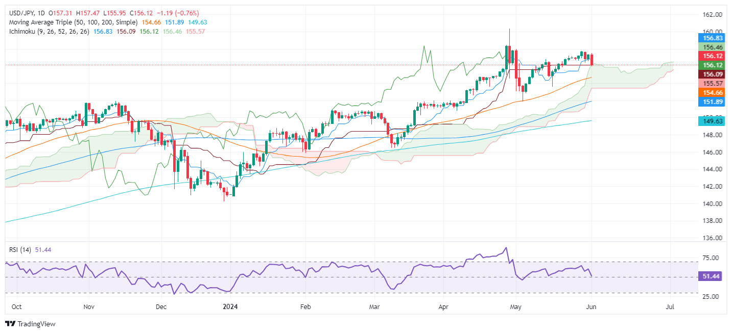 From a daily chart perspective, the USD/JPY failed to pierce the 157.50 resistance level and dived below the 157.00 figure, exacerbating a drop below the top of the Ichimoku Cloud (Kumo) at around 155.95, opening the door for further losses.