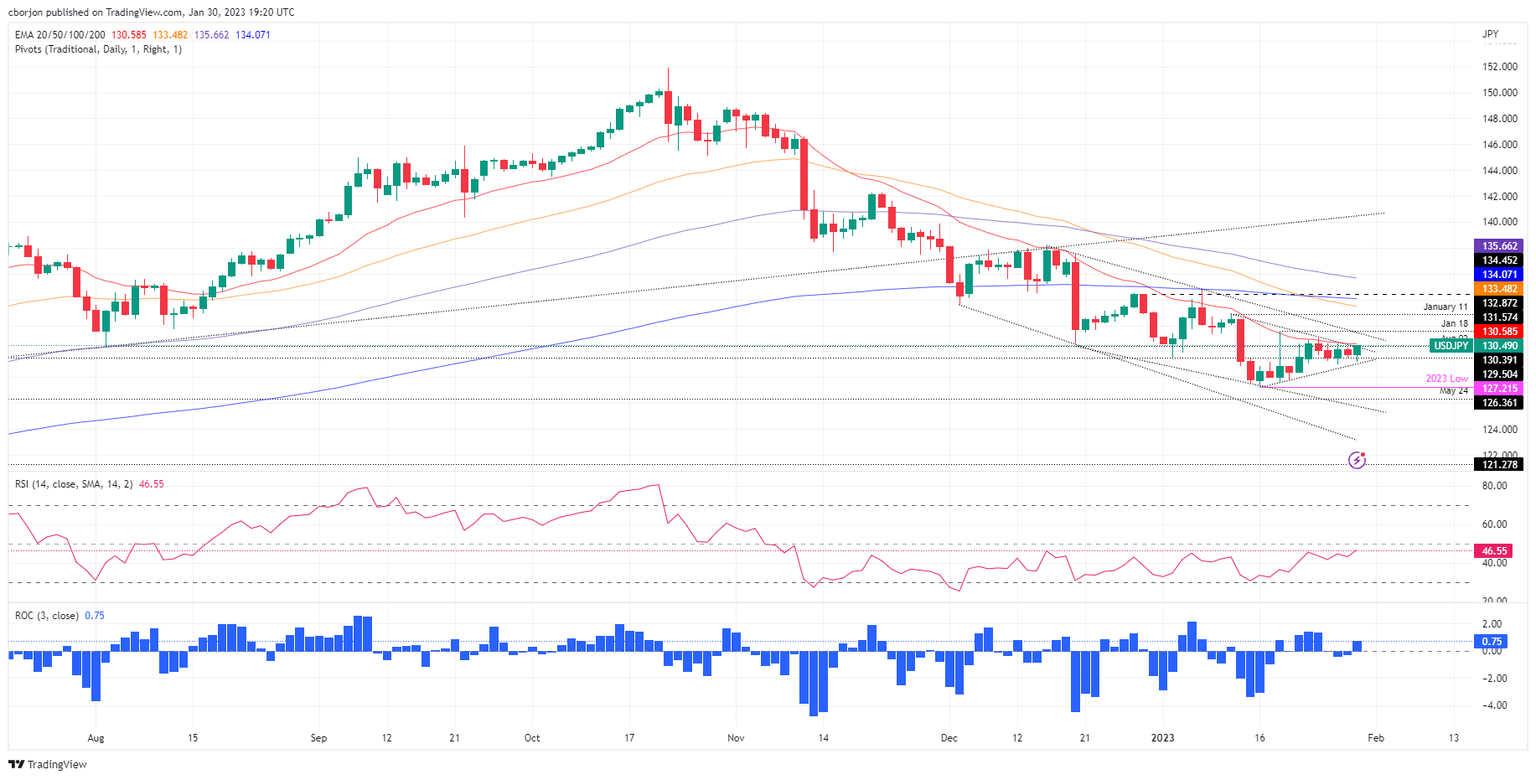 USD/JPY erases last Friday’s losses and reaches a new session high at 130.49, though slightly beneath the 20-day Exponential Moving Average (EMA), used as a barometer for short-term bias, which remains above the exchange rate. Therefore, the USD/JPY remains bearish despite trading at 130.49, above its opening price by 0.56%.